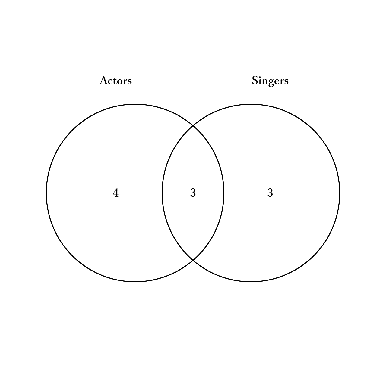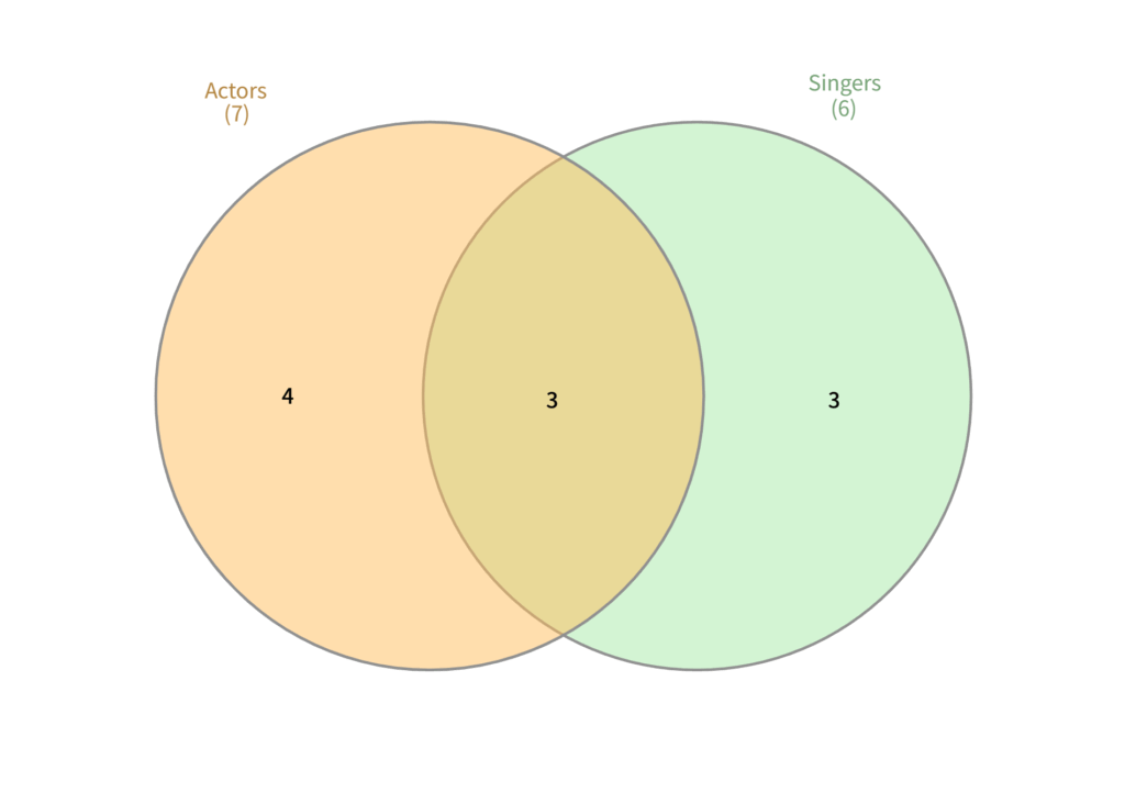歌手だけやっていて俳優でない人、俳優だけやっていて歌手ではない人の数も知りたいというときこれらのサイトを使うと次のような図を書くことができます。それぞれのリストをコピーして、サイトのSet AとかSet B(あるいはList 1, List 2)などと書いてある部分にペーストします。ペーストした集合の名前をSet Aから、Actorsに、Set BをSingersにかえれば下のようなベン図がかけるので試してみてください。俳優だけやっている人が4人、歌手だけやっている人が3人、俳優で歌手の人が3人いることがわかります。今回は7人と6人からなる二つの集合のベン図を書いてみましたが、遺伝子解析などの場合は要素の数が数千から一万を超える集合のベン図を書きたい場合も多いと思います。そうした場合には上のサイトはとても便利です。