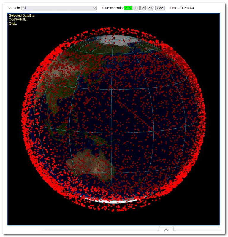 このサイトで打ち上げられているすべての衛星を表示したのが下の図です。赤い点一つ一つが衛星です。ものすごい数ですねぇ!暗い部分は地球の夜の部分、明るいのは昼の部分です。サイトではこの地球儀を自由にマウスで回転させて観察できます。